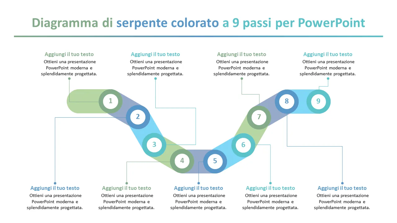 Un vivace modello PowerPoint di diagramma a serpente in 9 passaggi progettato per visualizzare flussi di processo complessi. Perfetto per presentazioni di strategia aziendale, operazioni e gestione dei progetti.