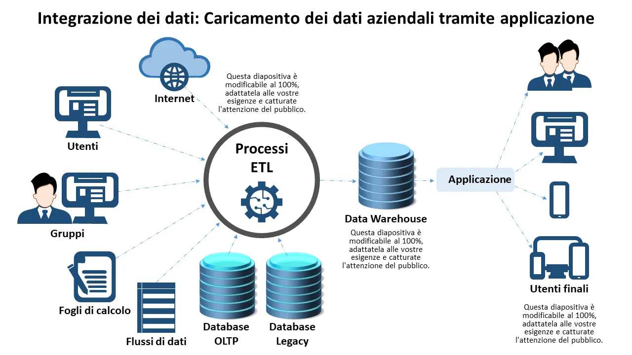 Un'integrazione dei dati progettata in modo professionale che mostra il carico dei dati aziendali con l'applicazione e gli utenti finali per presentazioni di analisi dei dati. Diapositive modificabili dal design moderno, ideali per professionisti aziendali, consulenti e team. Layout pulito e...