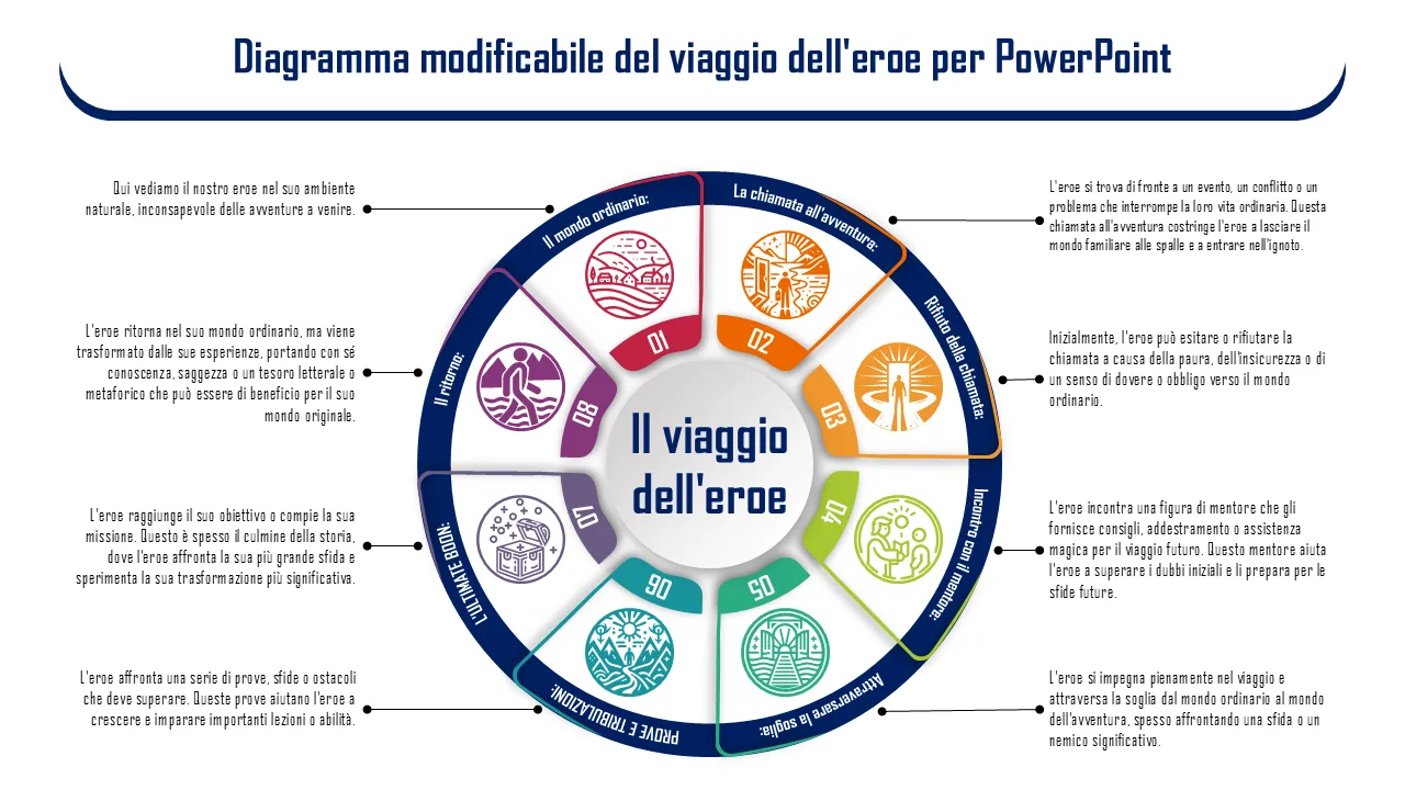 Diagramma modificabile del viaggio dell'eroe per PowerPoint Modello PowerPoint per presentazioni professionali