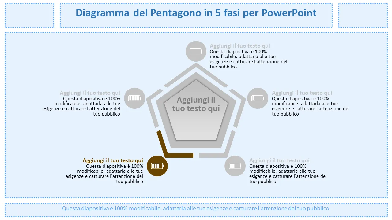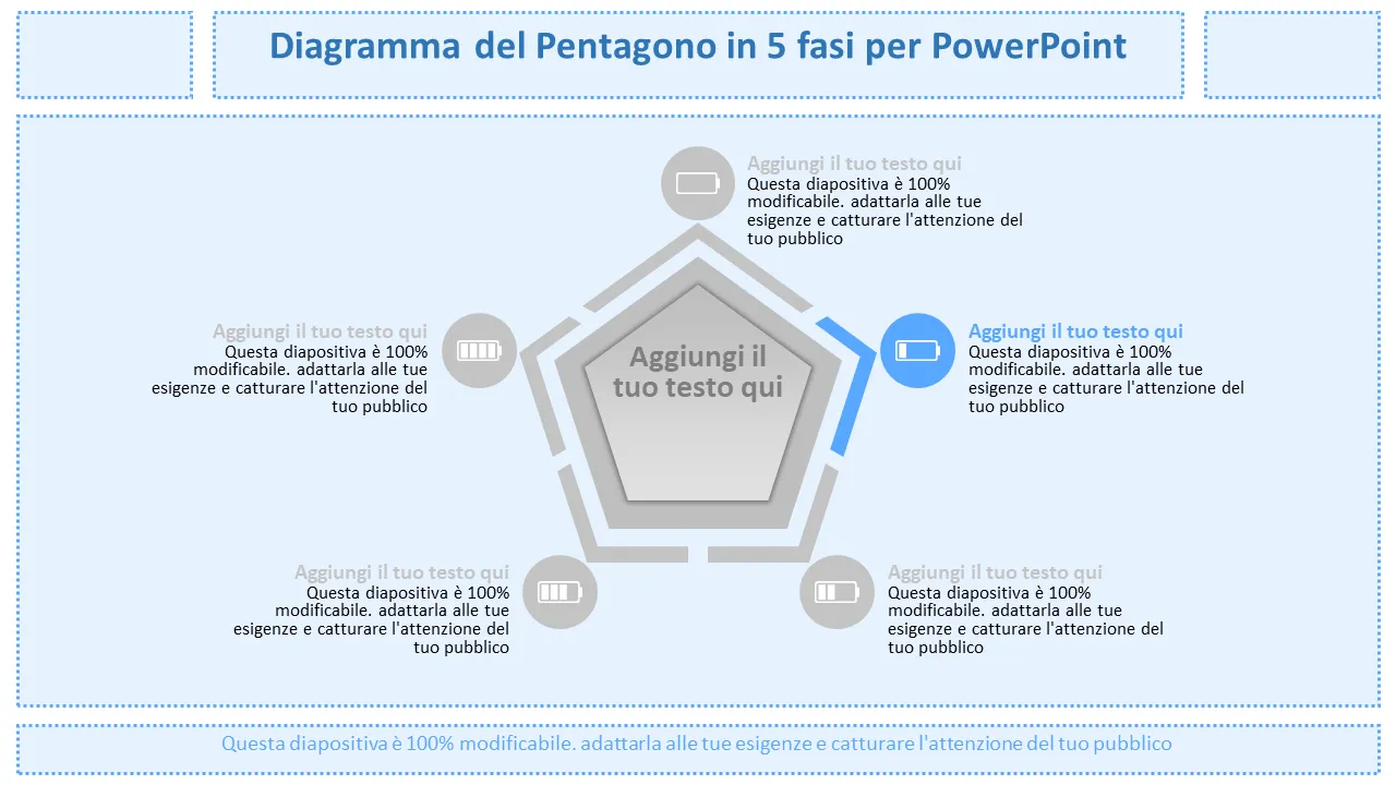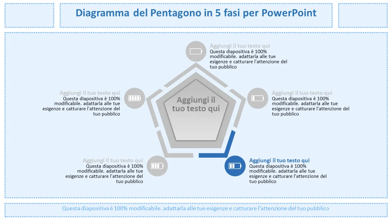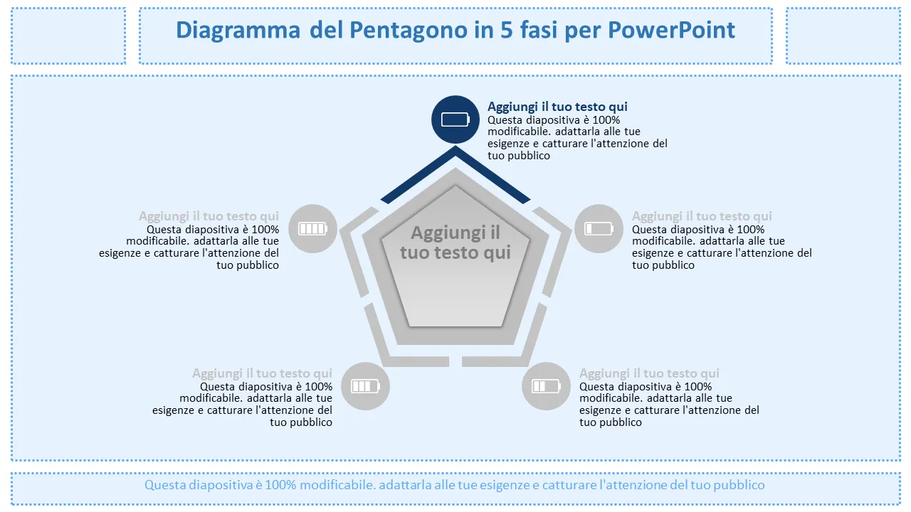 - Cinque distinte forme pentagonali disposte in un flusso circolare per una presentazione intuitiva passo dopo passo