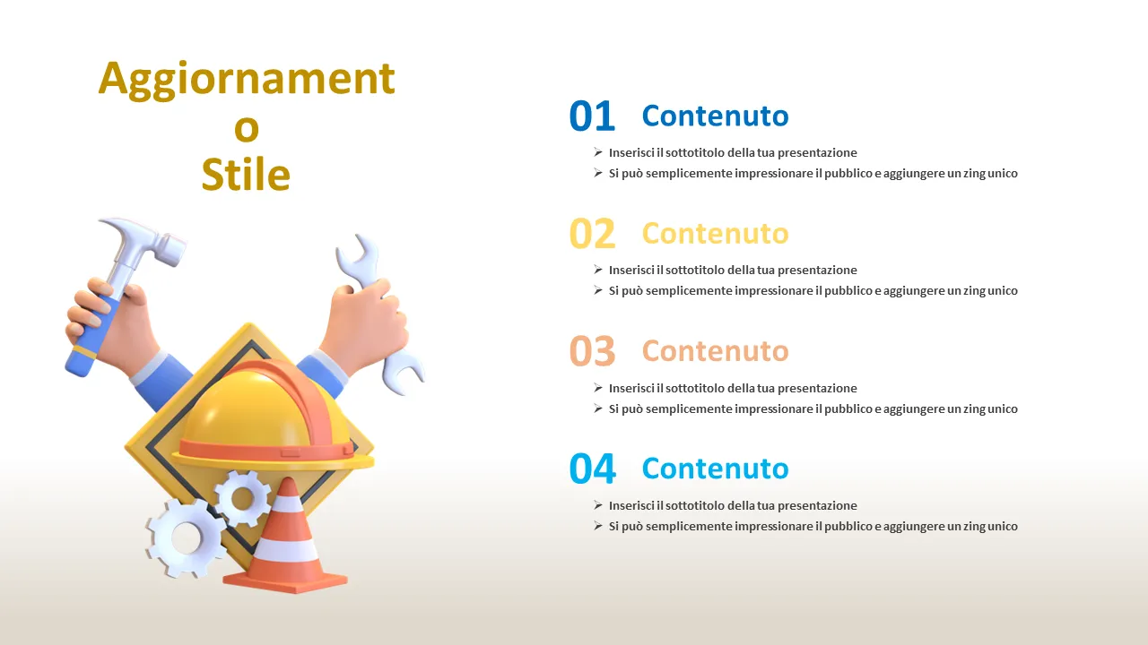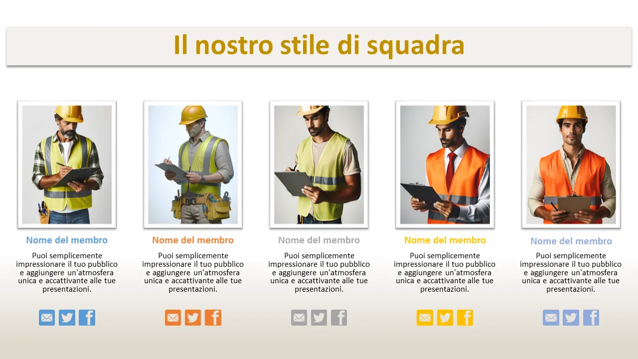 Questo modello PowerPoint di grande impatto visivo offre un audace tema di costruzione urbana incentrato sui caschi di sicurezza e sulle infrastrutture cittadine, ideale per trasmettere concetti di forte strategia aziendale. Progettato con linee pulite, infografiche professionali e layout dinamici, supporta messaggi complessi con chiarezza. Il modello è pensato su misura per il pubblico aziendale e di startup che cerca di comunicare crescita, innovazione ed eccellenza operativa in un formato visivo memorabile.