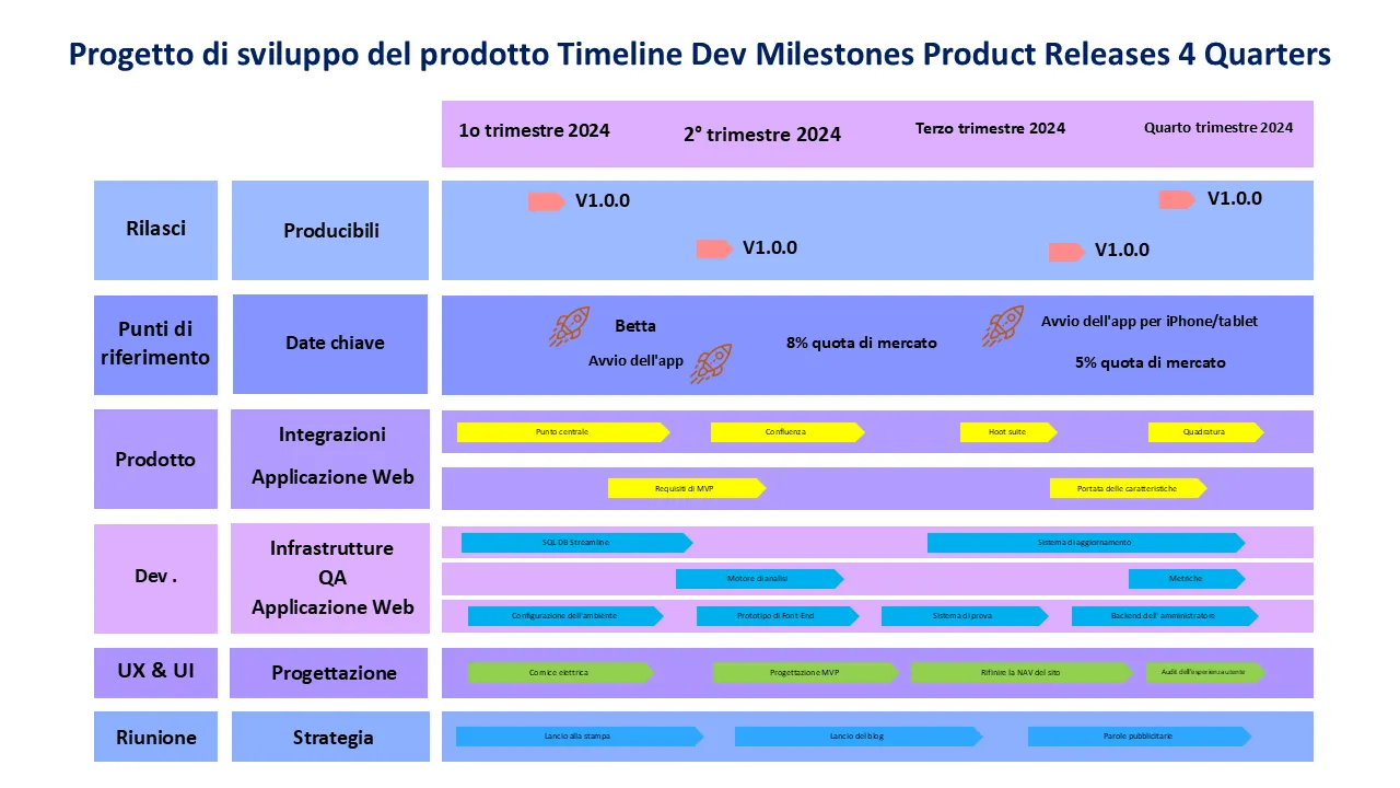Questo modello PowerPoint dal design professionale presenta i concetti della roadmap tecnologica attraverso elementi visivi strutturati, tipografia pulita e un linguaggio di design moderno. Aiuta i relatori a comunicare idee complesse con chiarezza e impatto, rendendolo ideale per sale riunioni, riunioni virtuali e presentazioni a conferenze. Il modello bilancia l'attrattiva visiva con la profondità informativa, garantendo che ogni diapositiva offra il massimo valore al pubblico.