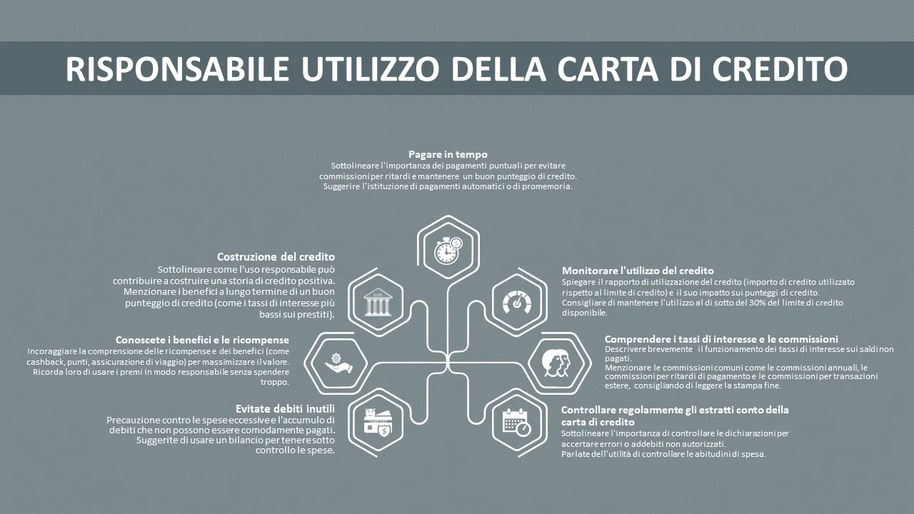 Istituti finanziari, emittenti di carte di credito e startup fintech utilizzano questo modello per educare i clienti o integrare nuovi utenti. È perfetto anche per sessioni di formazione interna, presentazioni per gli investitori o materiale di marketing che spiega le offerte di carte di credito. Il modello è adatto a ruoli come consulenti finanziari, responsabili del servizio clienti ed esperti di marketing di prodotto nei settori bancario, fintech e vendita al dettaglio.