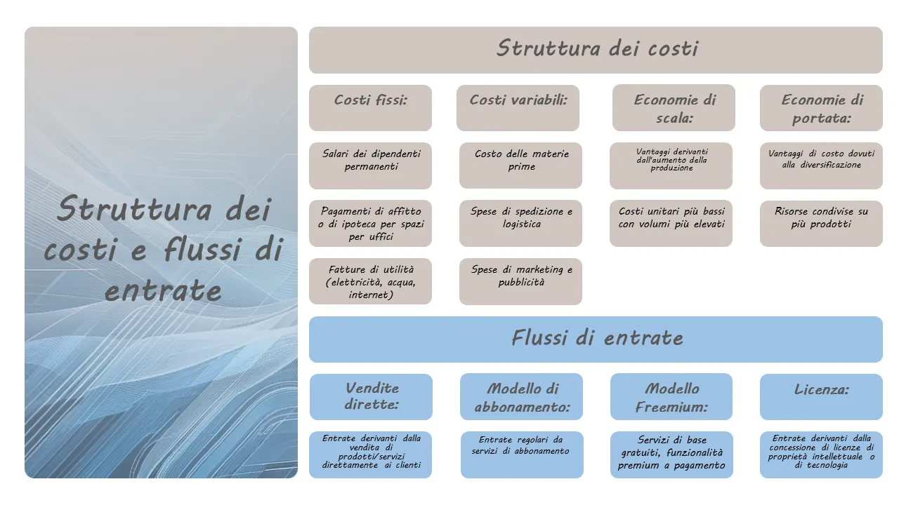 - Segnaposto pronti all'uso per elementi chiave del modello di business come struttura dei costi e partner chiave