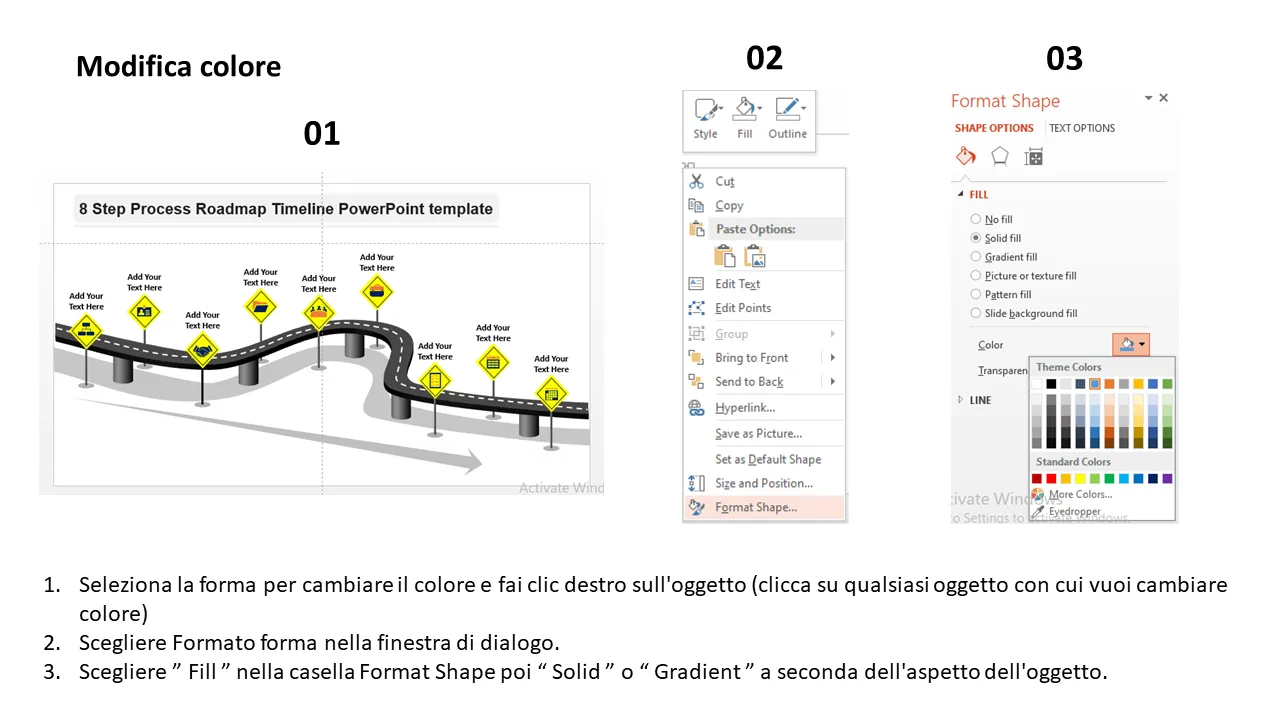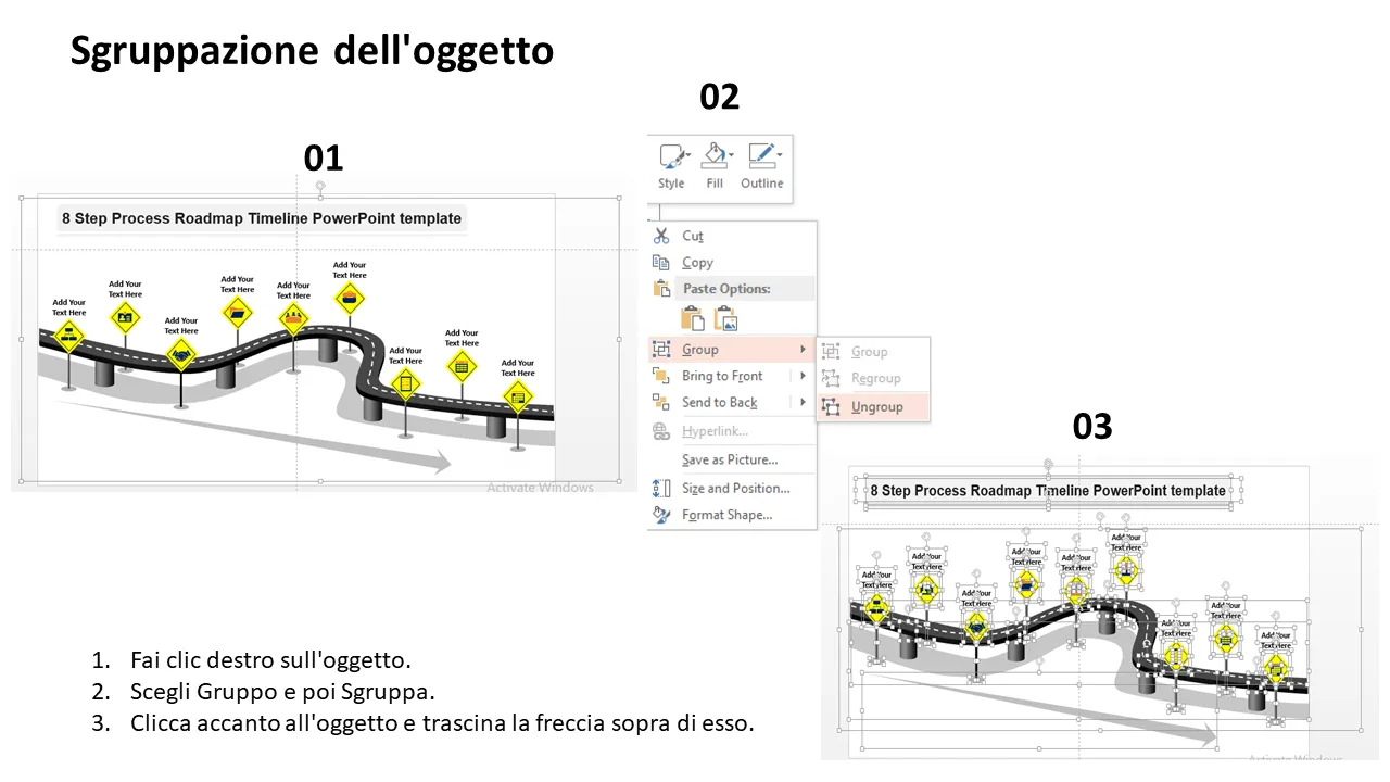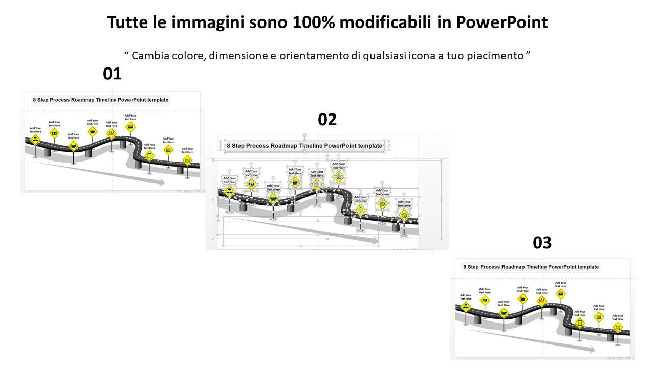 Modello Powerpoint con sequenza temporale della roadmap del processo in 8 fasi