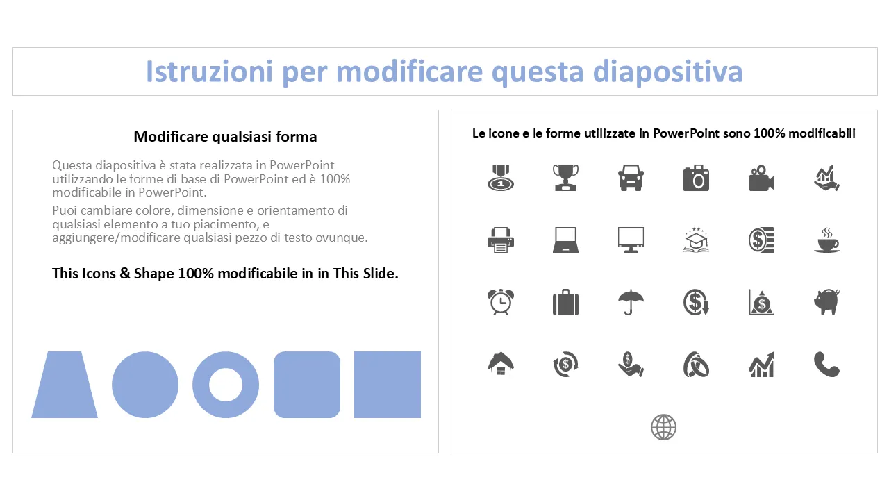 - Testo, forme, colori e icone completamente modificabili per la completa personalizzazione del marchio
