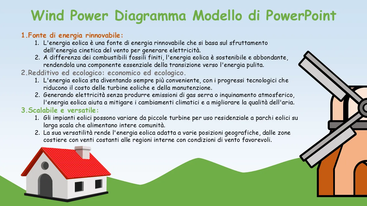 Caratteristiche di Modello PowerPoint di diagramma di energia eolica per presentazioni aziendali