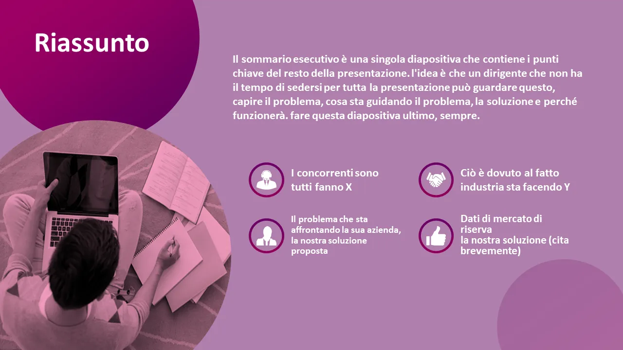 - Diapositiva di riepilogo progettata per la comprensione dell'ultimo minuto da parte di dirigenti impegnati