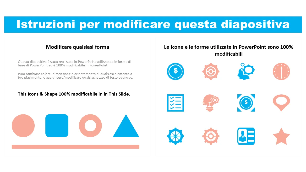 - Testo, forme, colori e icone completamente modificabili per la completa personalizzazione del marchio