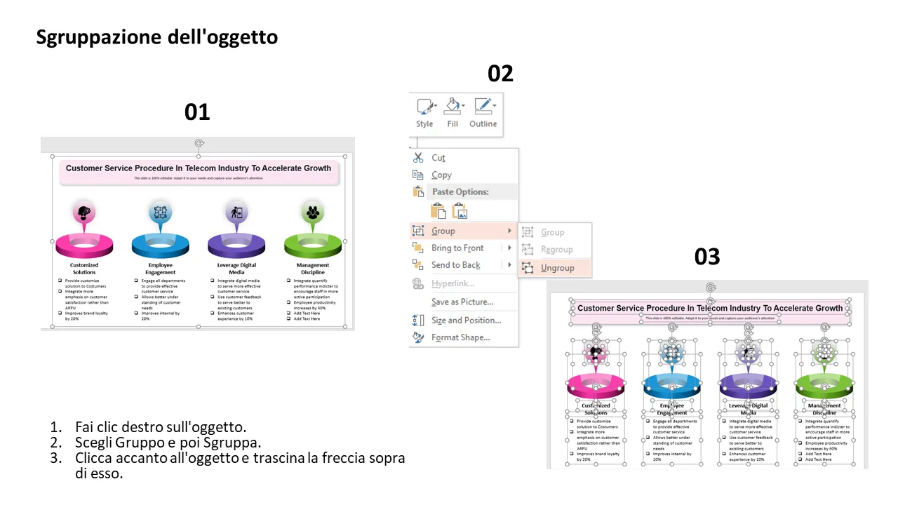 Questo modello PowerPoint professionale è progettato per aiutare le aziende di telecomunicazioni a delineare e presentare una chiara procedura di servizio clienti che favorisce la crescita attraverso una maggiore soddisfazione ed efficienza operativa. Enfatizza le strategie incentrate sul cliente rispetto ai parametri tradizionali come l'ARPU, rendendolo ideale per i team di leadership che cercano di riallineare le priorità. Il modello è completamente personalizzabile e visivamente accattivante e aiuta i relatori a comunicare in modo efficace i miglioramenti dei processi e le iniziative di coinvolgimento dei dipendenti.