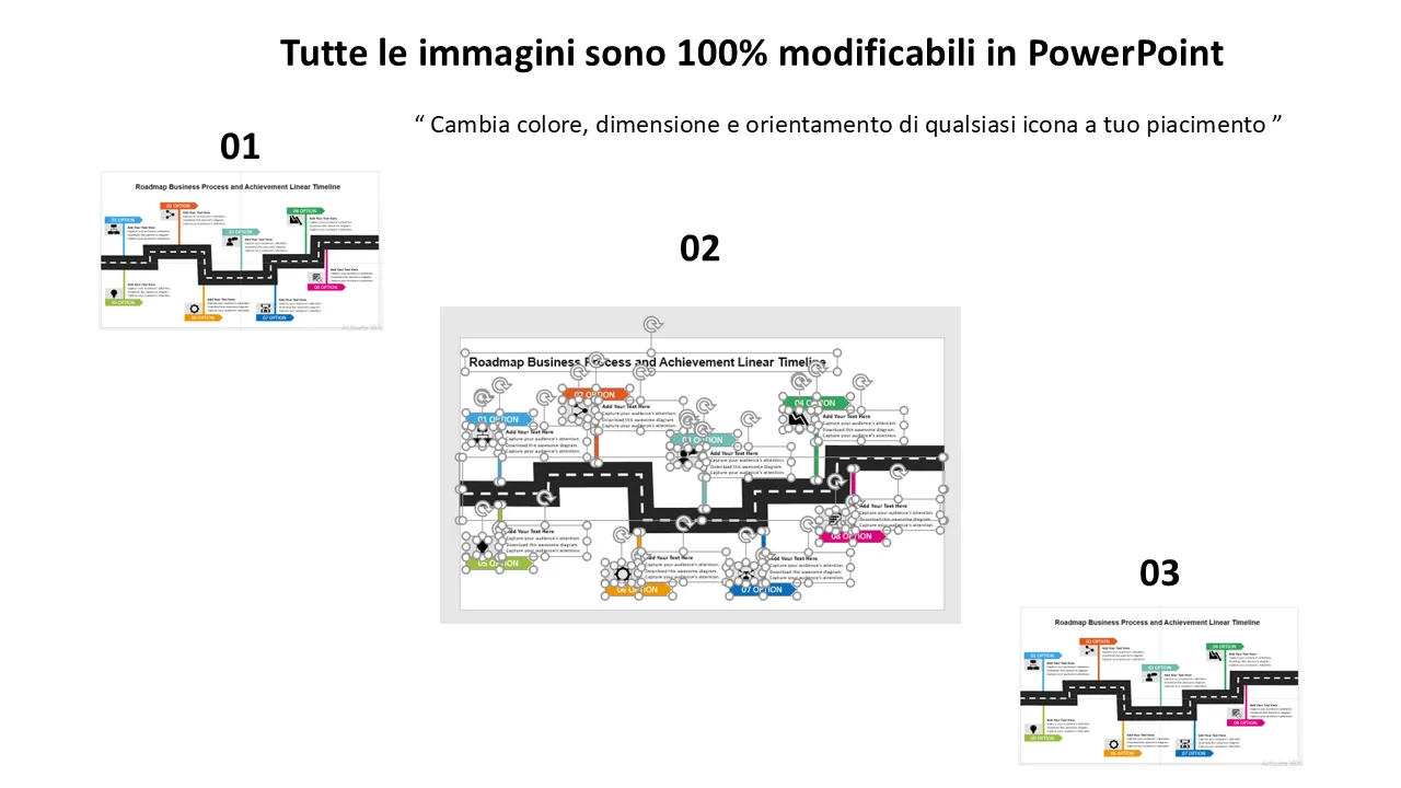 Caratteristiche di Roadmap Processo aziendale e realizzazione Timeline lineare Modello PowerPoint di design piatto PowerPoint per presentazioni professionali