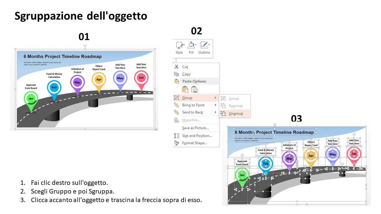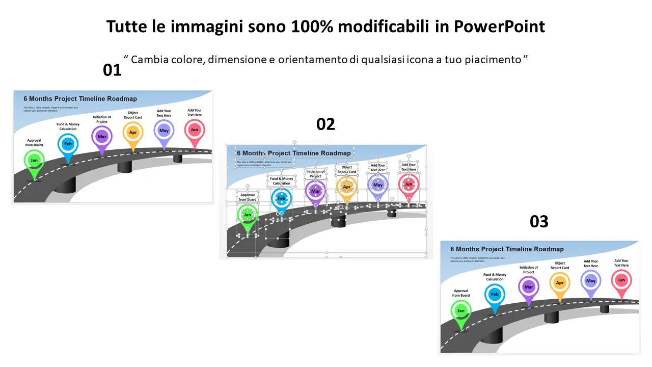 Questo modello PowerPoint professionale fornisce una chiara tabella di marcia visiva per la pianificazione e il monitoraggio di un progetto di sei mesi. Progettato per garantire chiarezza e impatto, aiuta i team a mappare le fasi chiave, i traguardi fondamentali e i risultati finali in un formato temporale strutturato. Ideale per project manager, dirigenti e team interfunzionali, questo strumento di pianificazione della roadmap supporta l'allineamento strategico e la comunicazione trasparente tra i dipartimenti.