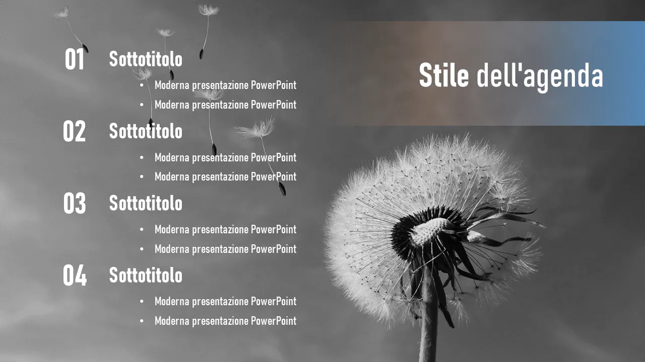 Questo elegante modello PowerPoint utilizza la metafora dei semi di dente di leone mossi dal vento per simboleggiare la crescita, la dispersione e l'espansione strategica. Ideale per presentazioni di strategie aziendali, rappresenta visivamente il modo in cui idee, mercati e opportunità si diffondono organicamente tra regioni o basi di clienti. Il design unisce l'estetica moderna con immagini naturali per creare mazzi memorabili e coinvolgenti che incontrano il pubblico.