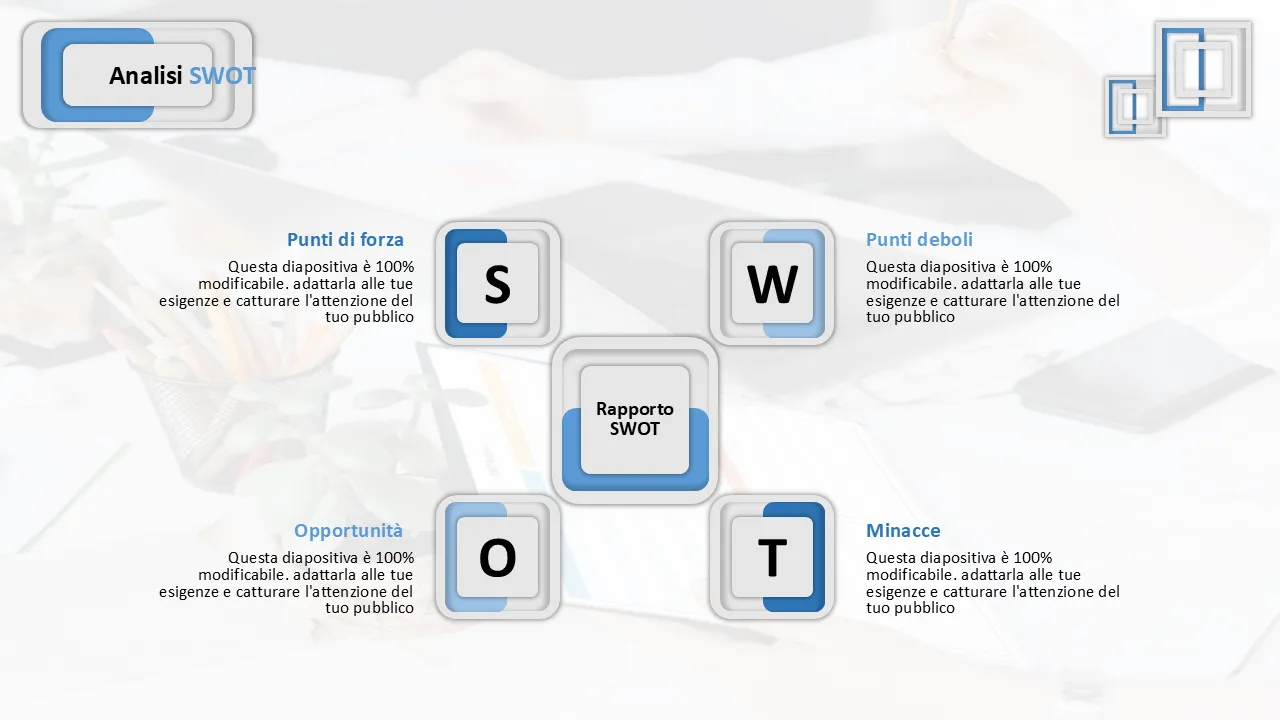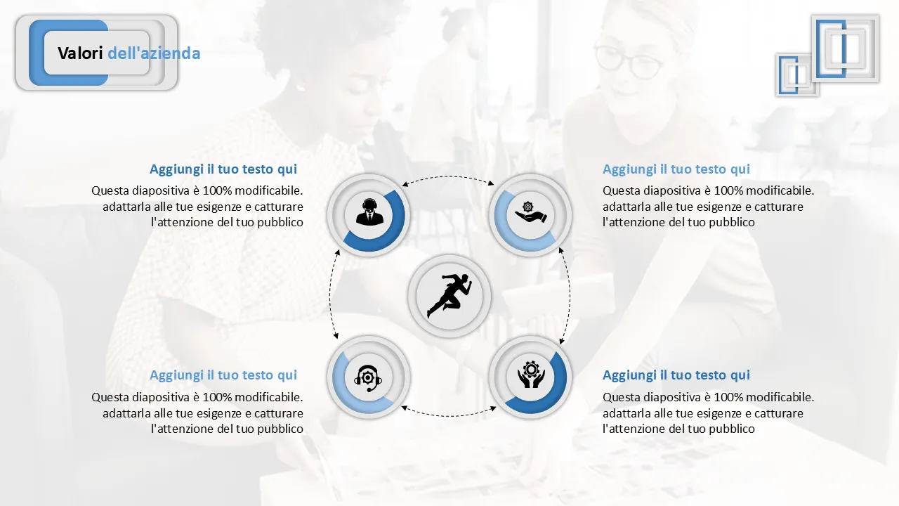 - Testo, forme, colori e icone completamente modificabili per una completa personalizzazione del marchio