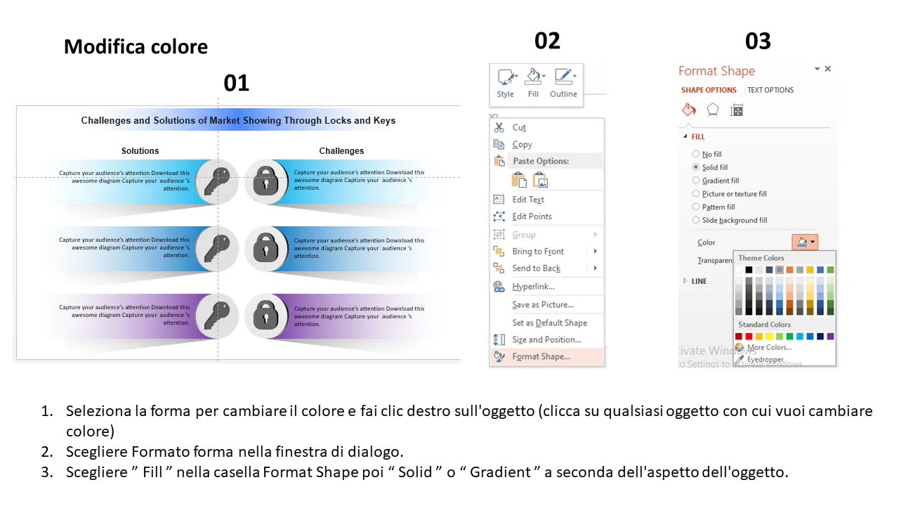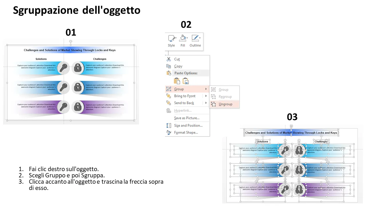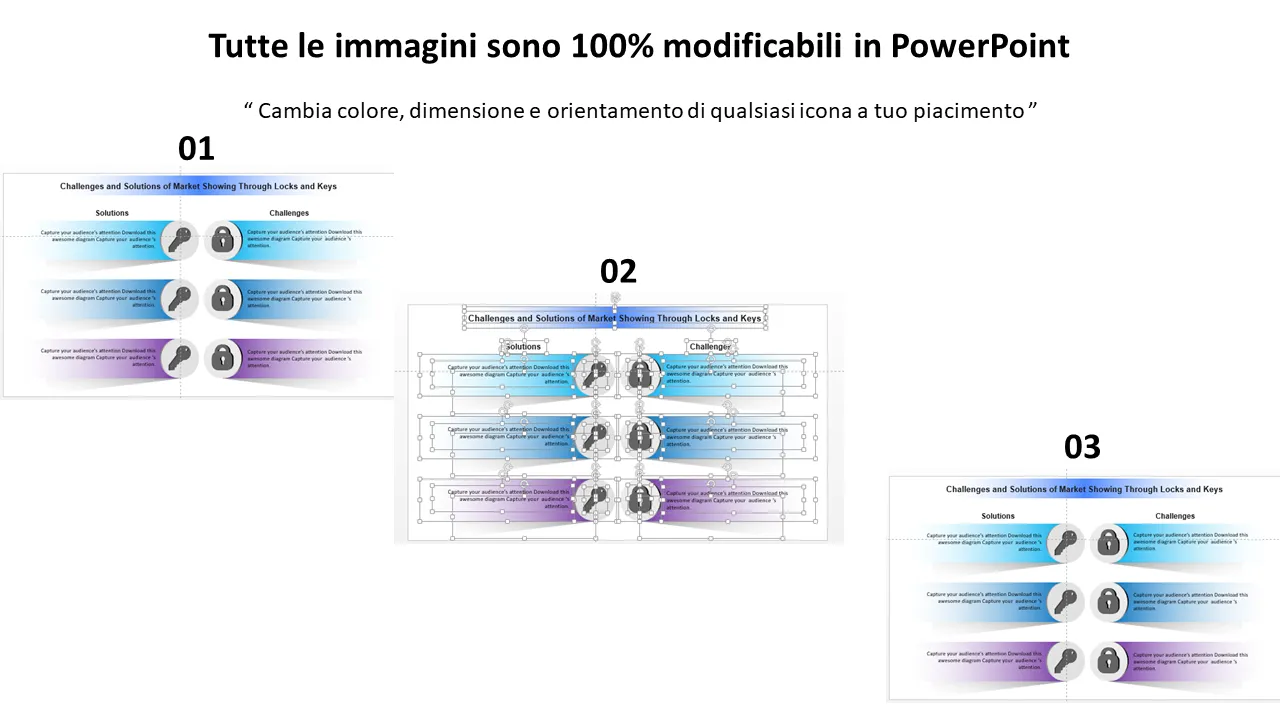 - Layout delle diapositive personalizzabili per presentare sfide e soluzioni specifiche