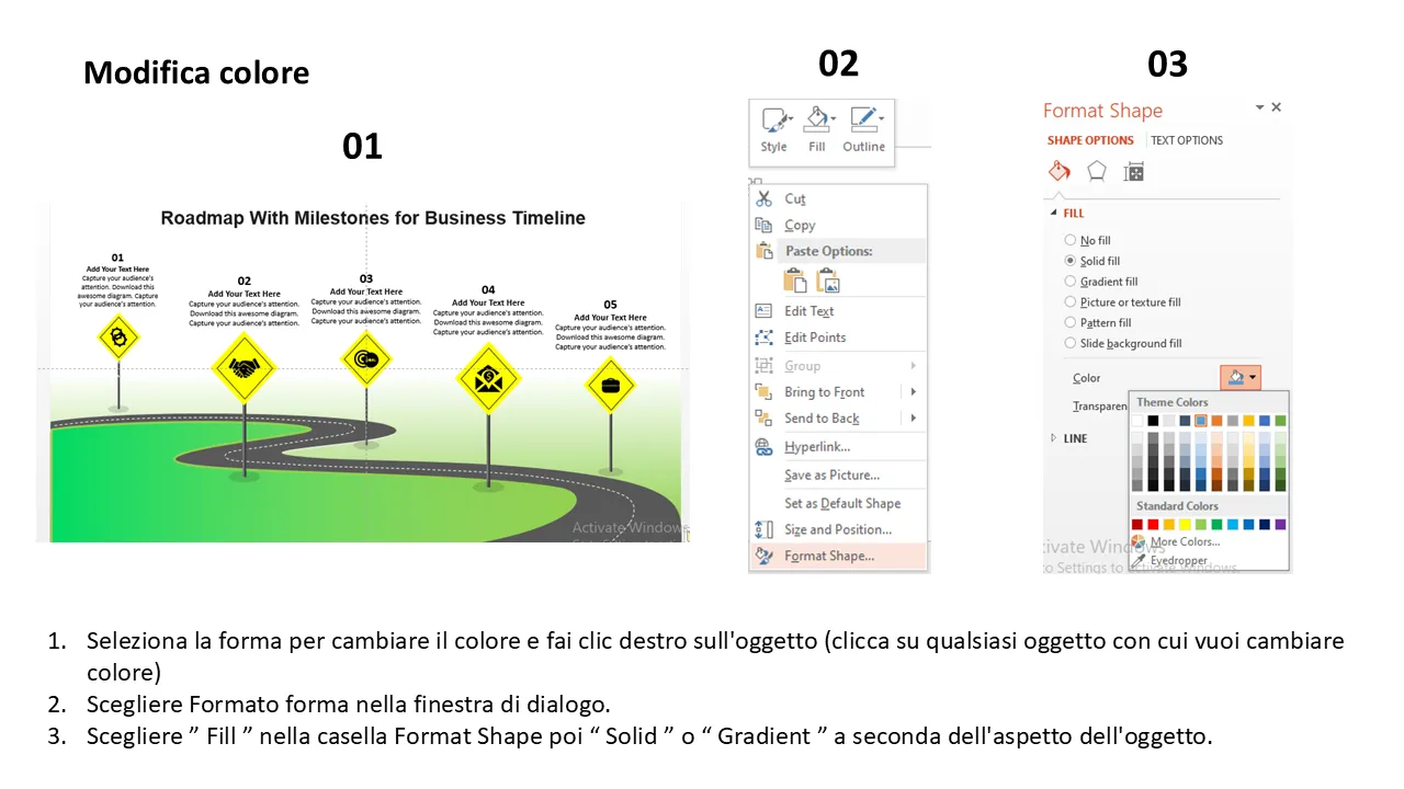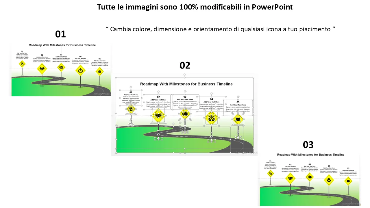 Roadmap con pietre miliari per la spiegazione del design piatto in Powerpoint della timeline aziendale