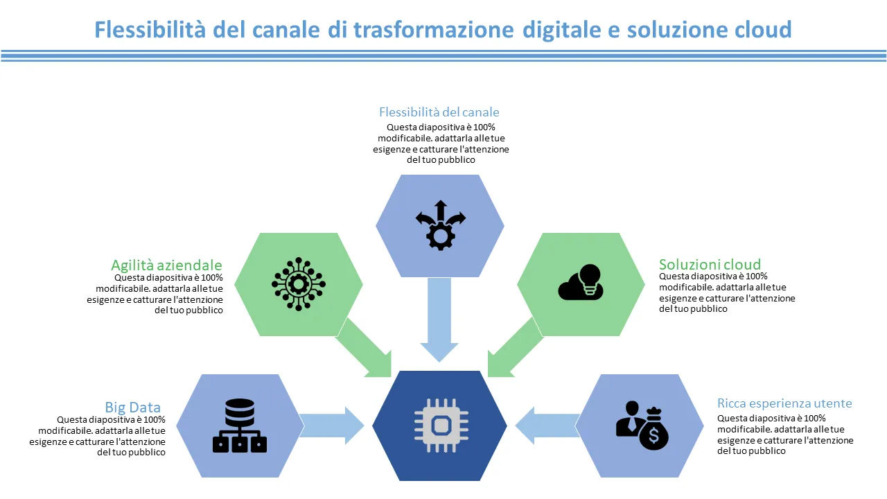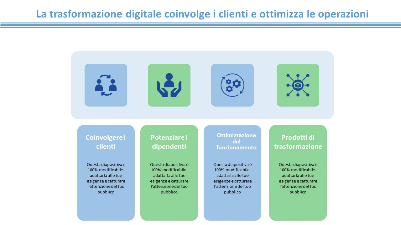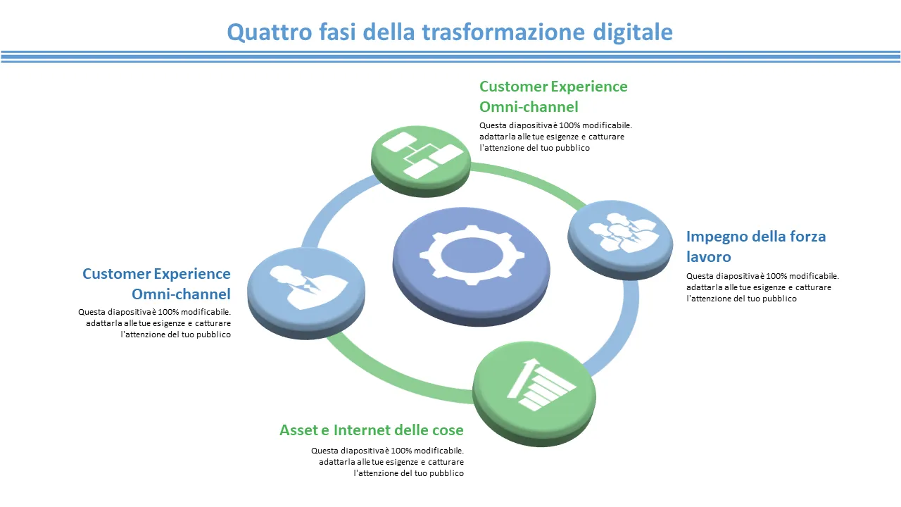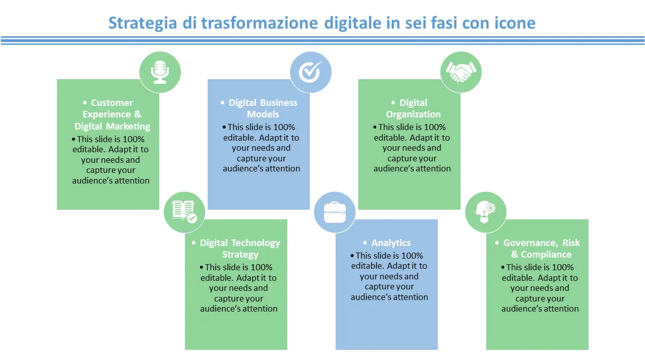 - Diapositive preformattate per i pilastri della strategia digitale: adozione della tecnologia, cambiamento organizzativo e analisi