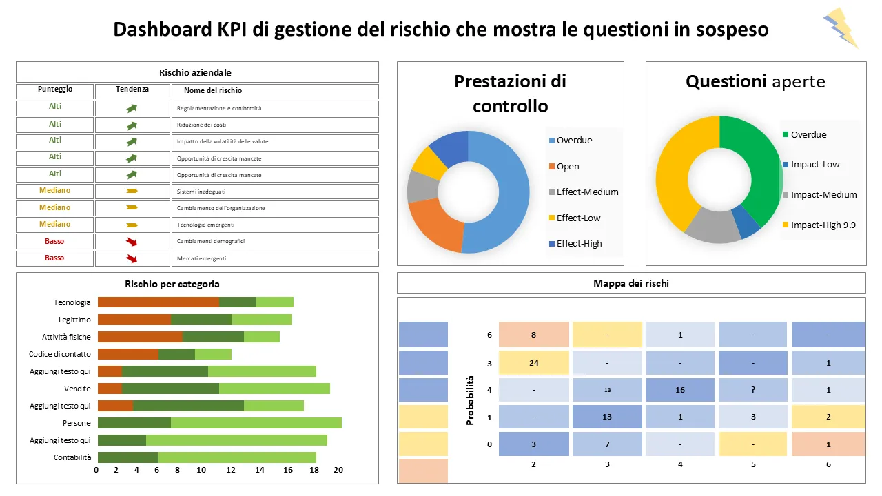 Dashboard KPI di gestione del rischio che mostra i problemi aperti e il modello PowerPoint delle prestazioni di controllo per presentazioni professionali